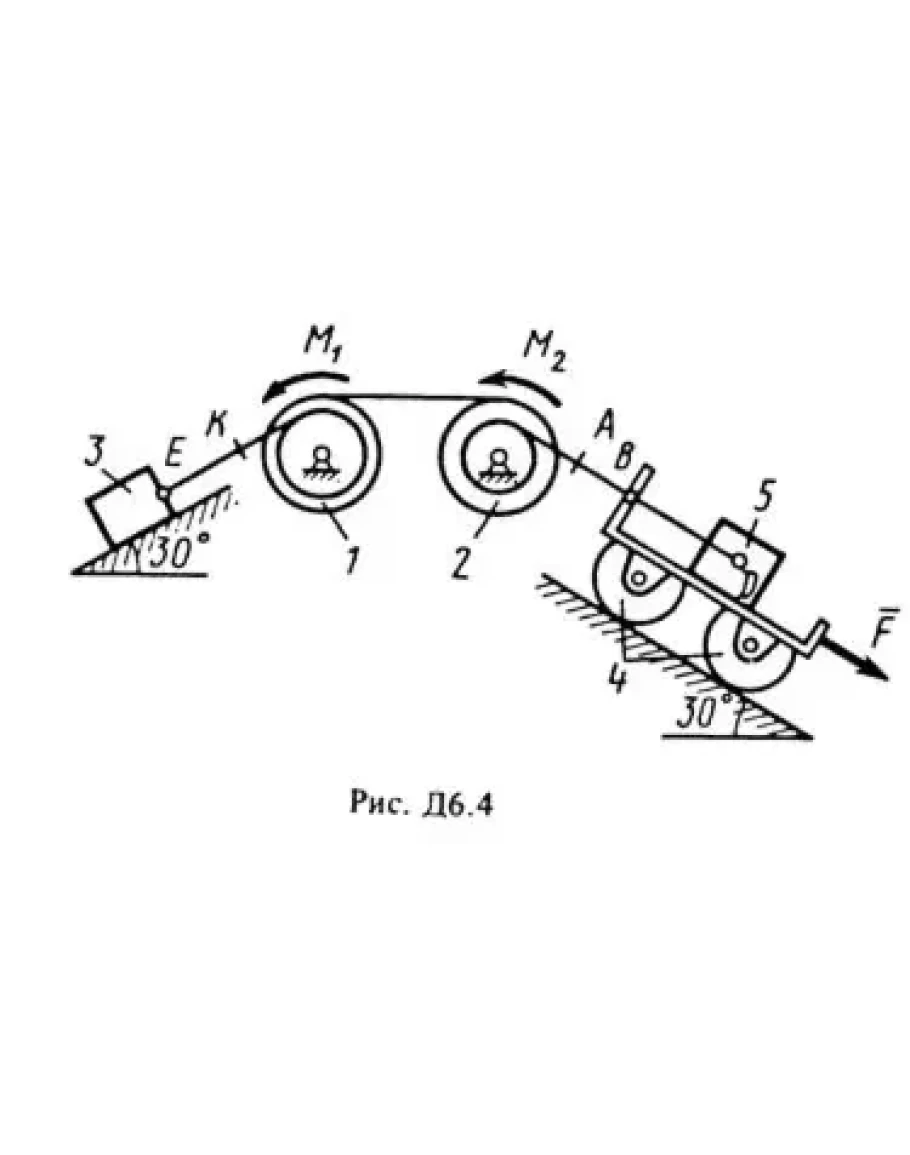 На систему кроме сил тяжести действуют сила F. приложенная к телу 4 или 5 (если тело 5 в систему не входит, сила приложена в точке В к тележке), и пары сил с моментами М1 и М2, приложенные к блокам (при М < 0 направление момента противоположно показанному на рисунке). На участке нити, указанном в таблице в столбце Пружина;, включена пружина с коэффициентом жесткости с (например, если в столбце стоит АВ, то участок АВ является пружиной, если AD то AD пружина, и т.д.); в начальный момент времени пружина не деформирована. Составить для системы уравнения Лагранжа и определить из них частоту и период колебаний, совершаемых телами системы при ее движении.