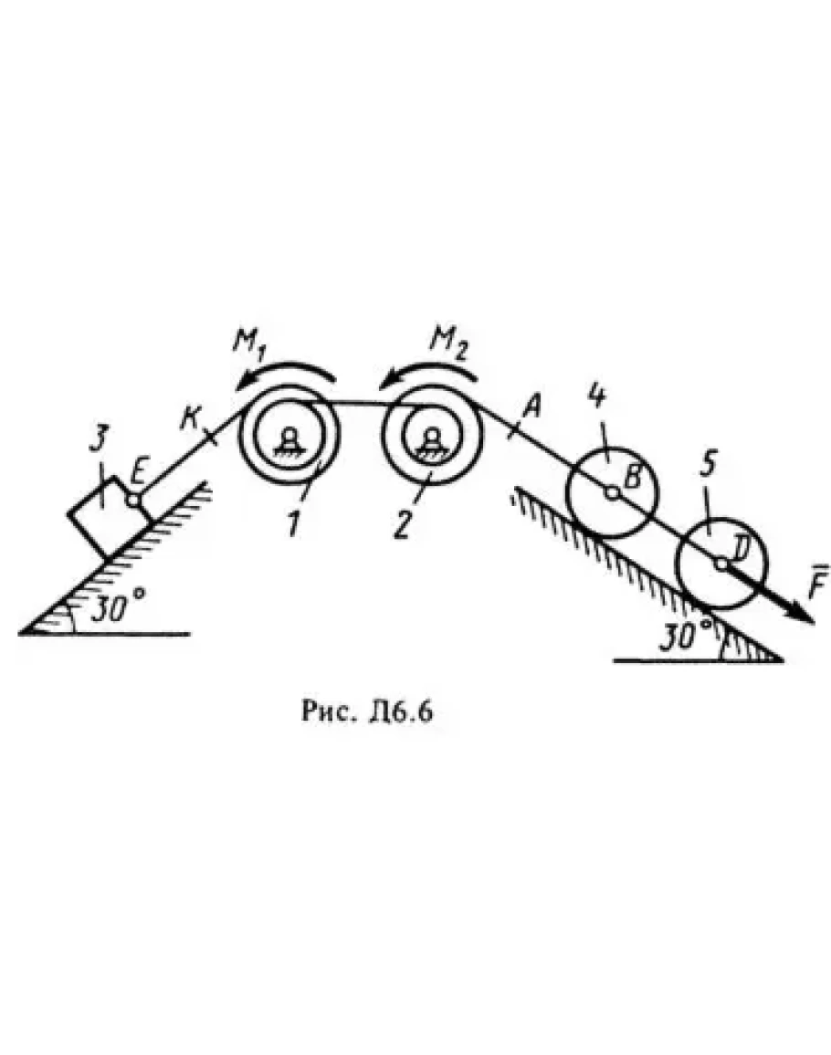 На систему кроме сил тяжести действуют сила F. приложенная к телу 4 или 5 (если тело 5 в систему не входит, сила приложена в точке В к тележке), и пары сил с моментами М1 и М2, приложенные к блокам (при М < 0 направление момента противоположно показанному на рисунке). На участке нити, указанном в таблице в столбце Пружина;, включена пружина с коэффициентом жесткости с (например, если в столбце стоит АВ, то участок АВ является пружиной, если AD то AD пружина, и т.д.); в начальный момент времени пружина не деформирована. Составить для системы уравнения Лагранжа и определить из них частоту и период колебаний, совершаемых телами системы при ее движении.