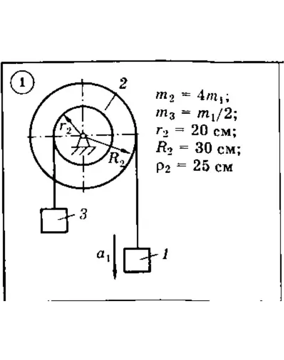 Для приведенных на схемах 1-30 механических систем, используя уравнения Лагранжа второго рода, определить указанное на схеме угловое ускорение или линейное ускорение. Нити невесомы и нерастяжимы. Принятые обозначения: т — массы тел, R и r — радиусы, р — радиус инерции (если он не указан, тело считать однородным цилиндром); при наличии трения указываются: f — коэффициент трения скольжения, fк — коэффициент трения качения.