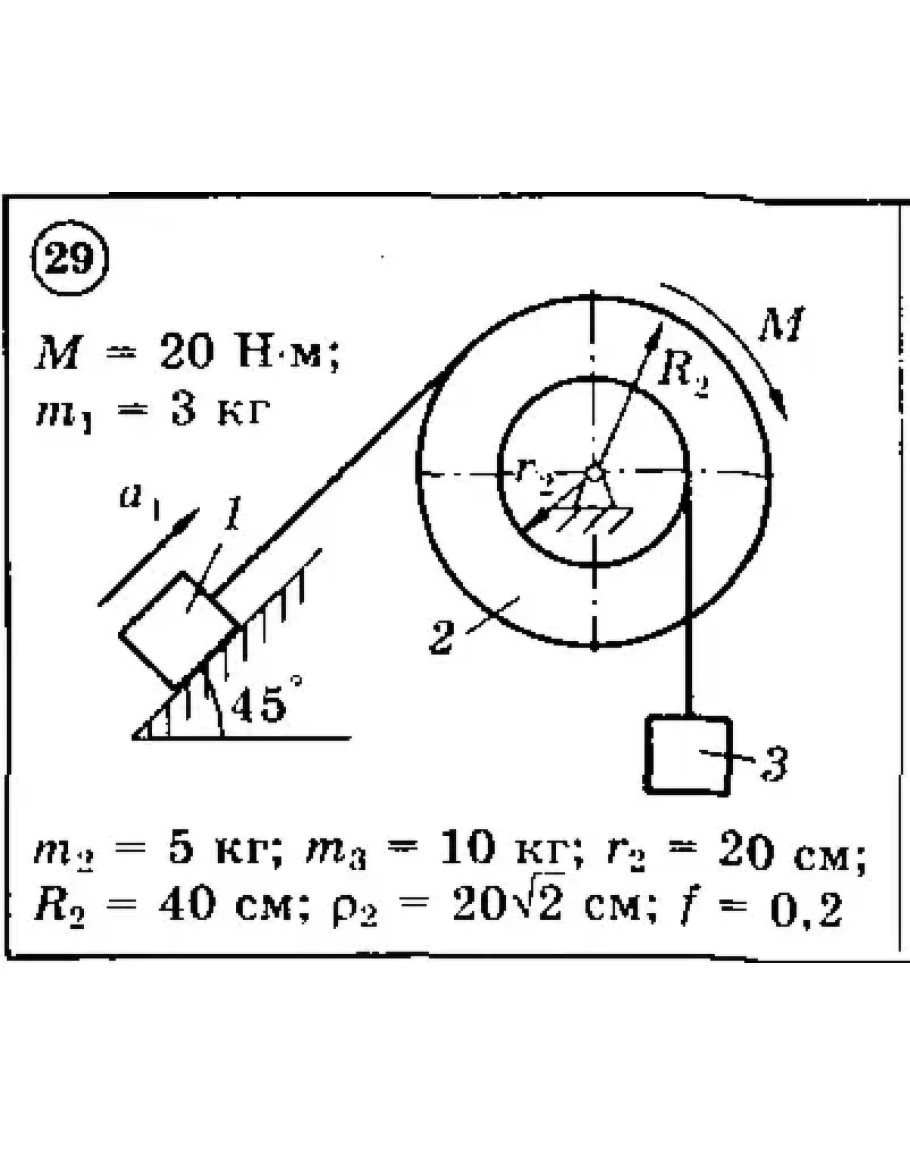 Для приведенных на схемах 1-30 механических систем, используя уравнения Лагранжа второго рода, определить указанное на схеме угловое ускорение или линейное ускорение. Нити невесомы и нерастяжимы. Принятые обозначения: т — массы тел, R и r — радиусы, р — радиус инерции (если он не указан, тело считать однородным цилиндром); при наличии трения указываются: f — коэффициент трения скольжения, fк — коэффициент трения качения.