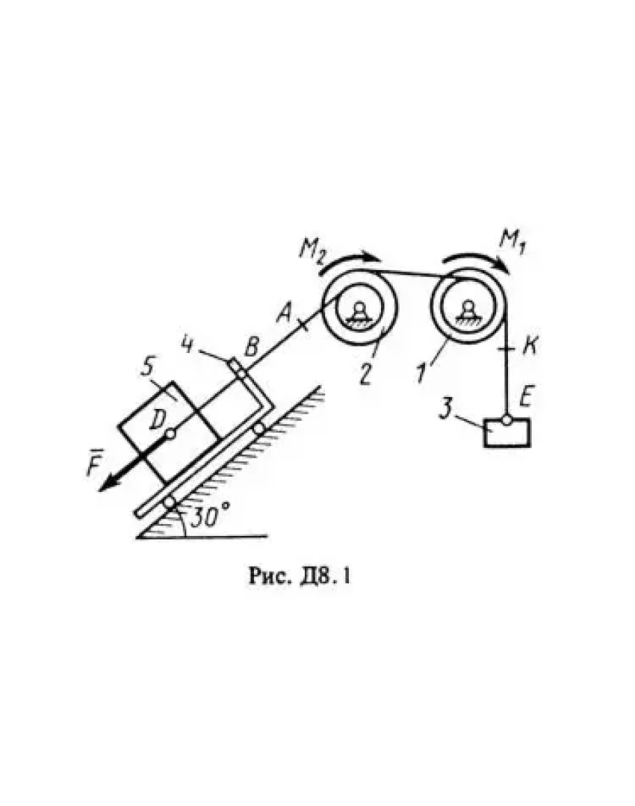 Механическая система состоит из тел 1, 2, ..., 5, имеющих веса Р1, Р2, ..., P5, связаных нитями, намотанными на ступенчатые блоки 1 и 2 (рис. Д8.0-Д8.9, табл. Д8). Прочерк в столбцах таблицы, где заданы веса, означает, что соответствующее тело в систему не входит (на чертеже не изображать), а ноль в столбцах таблицы означает, что тело считается невесомым, но в систему входит (на чертеже должно быть изображено). Для колес, обозначенных номером 4, Р4 - их общий вес (вес платформы такой тележки не учитывается).
