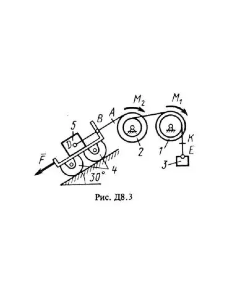 На систему кроме сил тяжести действуют сила F. приложенная к телу 4 или 5 (если тело 5 в систему не входит, сила приложена в точке В к тележке), и пары сил с моментами М1 и М2, приложенные к блокам (при М < 0 направление момента противоположно показанному на рисунке).