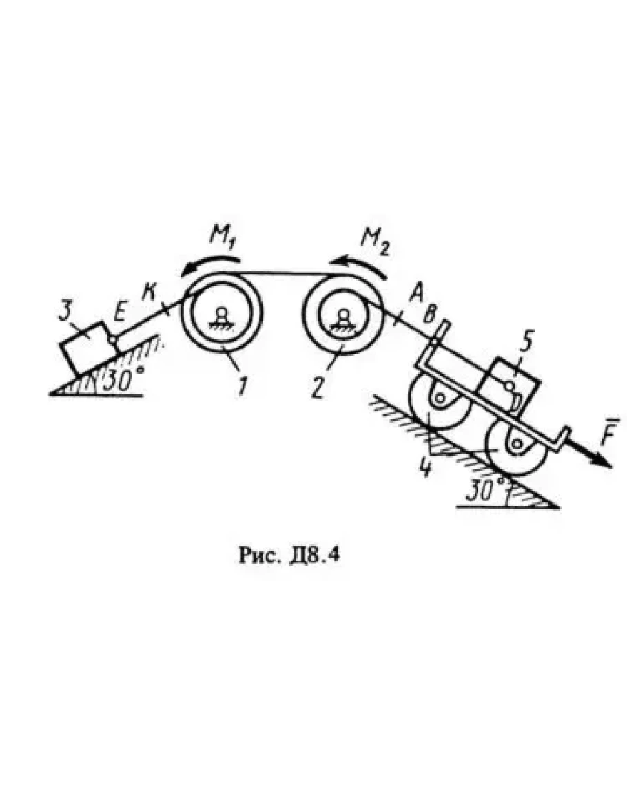 На систему кроме сил тяжести действуют сила F. приложенная к телу 4 или 5 (если тело 5 в систему не входит, сила приложена в точке В к тележке), и пары сил с моментами М1 и М2, приложенные к блокам (при М < 0 направление момента противоположно показанному на рисунке).