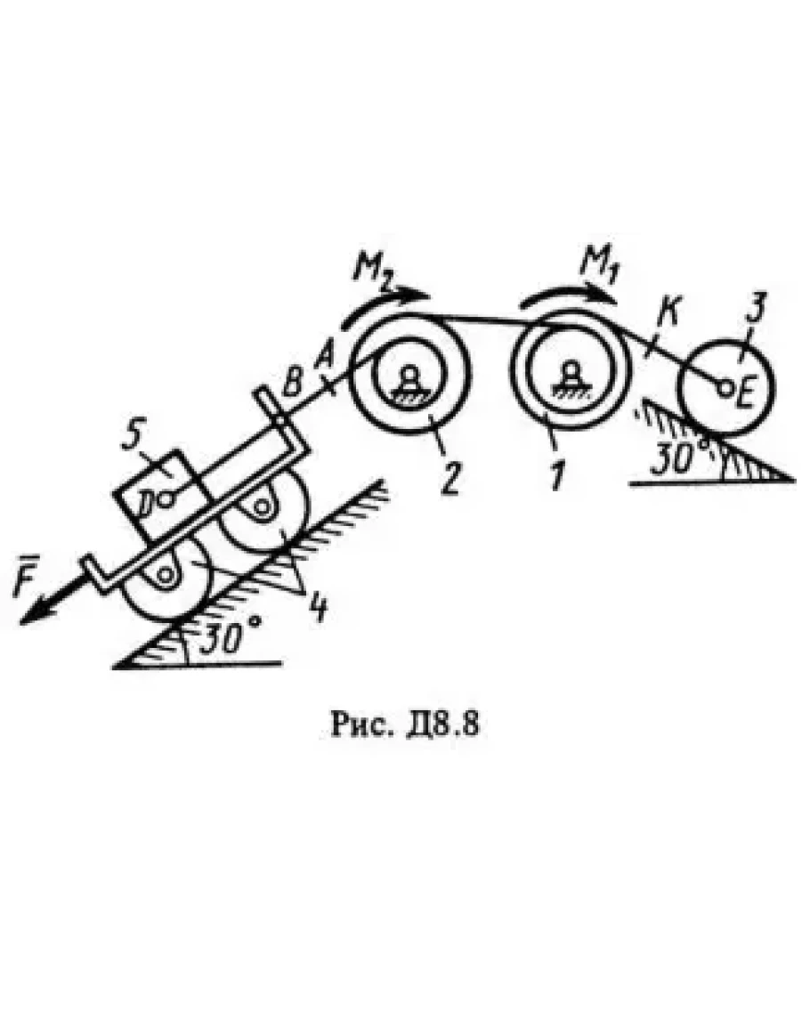 На систему кроме сил тяжести действуют сила F. приложенная к телу 4 или 5 (если тело 5 в систему не входит, сила приложена в точке В к тележке), и пары сил с моментами М1 и М2, приложенные к блокам (при М < 0 направление момента противоположно показанному на рисунке).