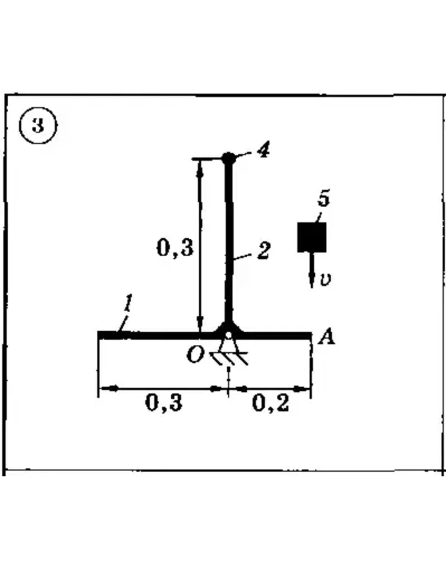 Тело 5 (материальная точка) массой т5 = 30 кг, двигаясь со скоростью v = 4 м/с, ударяется о неподвижную конструкцию в точке А, причем удар является абсолютно неупругим.