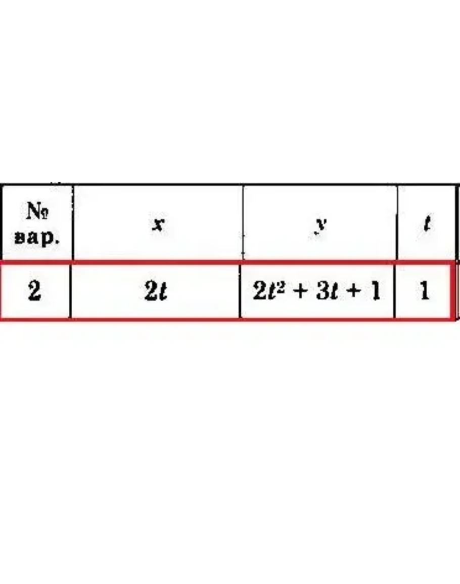 В соответствии с заданными уравнениями движения (варианты 1 - 30) определить траекторию движения точки. Для заданного момента времени t найти положение точки на траектории, ее скорость и ускорение (показать их на рисунке), а также радиус кривизны траектории в соответствующей точке. Данные, необходимые для вычисления, представлены ниже. Координаты х и у даны в метрах, время в секундах.