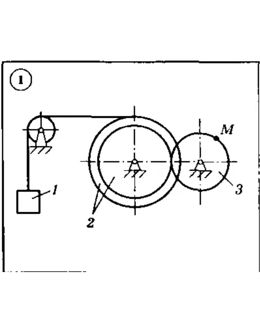 Для приведенных ниже схем механизмов 1-30 по известным характеристикам движения груза 1 — скорости V1x и ускорению а1х, или по заданному уравнению движения тела 1 — x(t), или по заданному уравнению движения вала 3 — Ф3(t) определить и показать на рисунке скорость и ускорение точки М, а также скорость и ускорение груза 1 в данный момент времени. Исходные данные, включая радиусы шестерен, шкивов и барабанов, приведены в таблице.