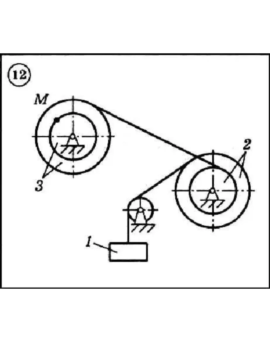 Для приведенной ниже схемы механизма по заданному уравнению движения тела 1 - x(t) определить и показать на рисунке скорость и ускорение точки М, а также скорость и ускорение груза 1 в данный момент времени. Исходные данные, включая радиусы шестерен, шкивов и барабанов, приведены в таблице.