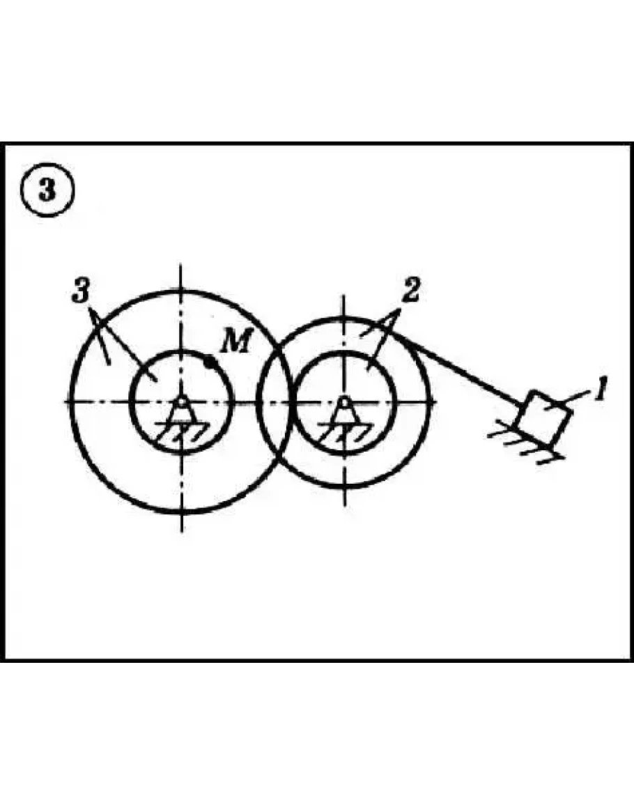 Для приведенной ниже схемы механизма по заданному уравнению движения тела 1 - x(t) определить и показать на рисунке скорость и ускорение точки М, а также скорость и ускорение груза 1 в данный момент времени. Исходные данные, включая радиусы шестерен, шкивов и барабанов, приведены в таблице.