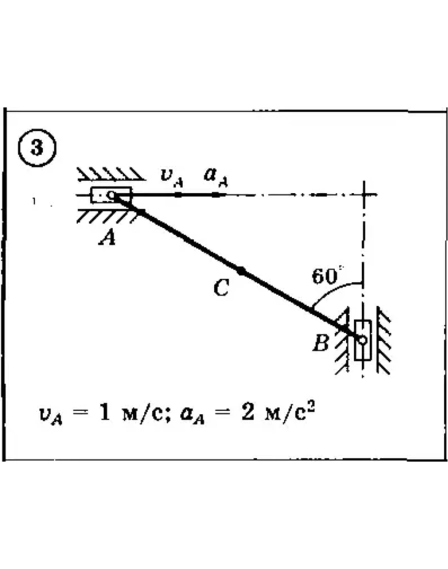 Для представленных на схемах 1-30 механизмов, состоящих из шатуна АВ длиной 2 м и двух ползунов, по заданным величинам скорости и ускорения ползуна А определить скорость и ускорение ползуна В и средней точки С шатуна, а также угловую скорость и угловое ускорение шатуна.