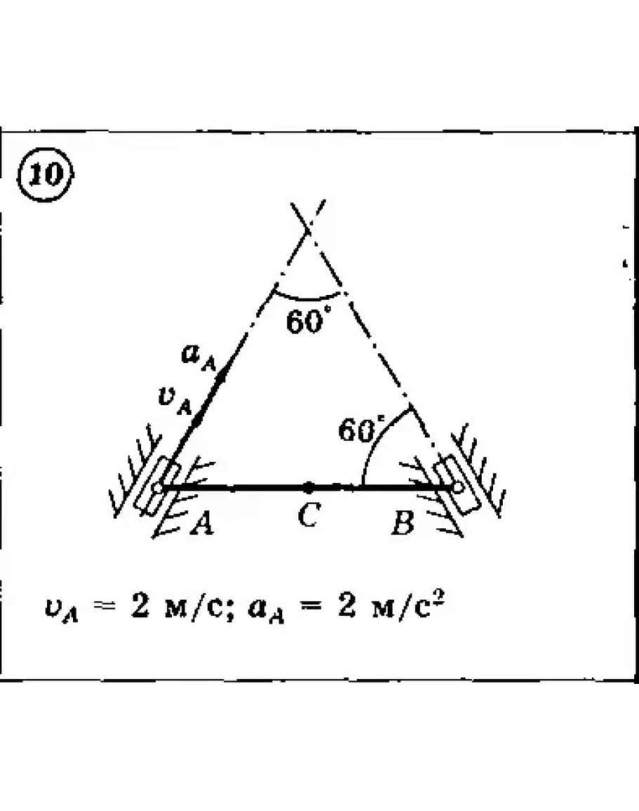 Для представленных на схемах 1-30 механизмов, состоящих из шатуна АВ длиной 2 м и двух ползунов, по заданным величинам скорости и ускорения ползуна А определить скорость и ускорение ползуна В и средней точки С шатуна, а также угловую скорость и угловое ускорение шатуна.