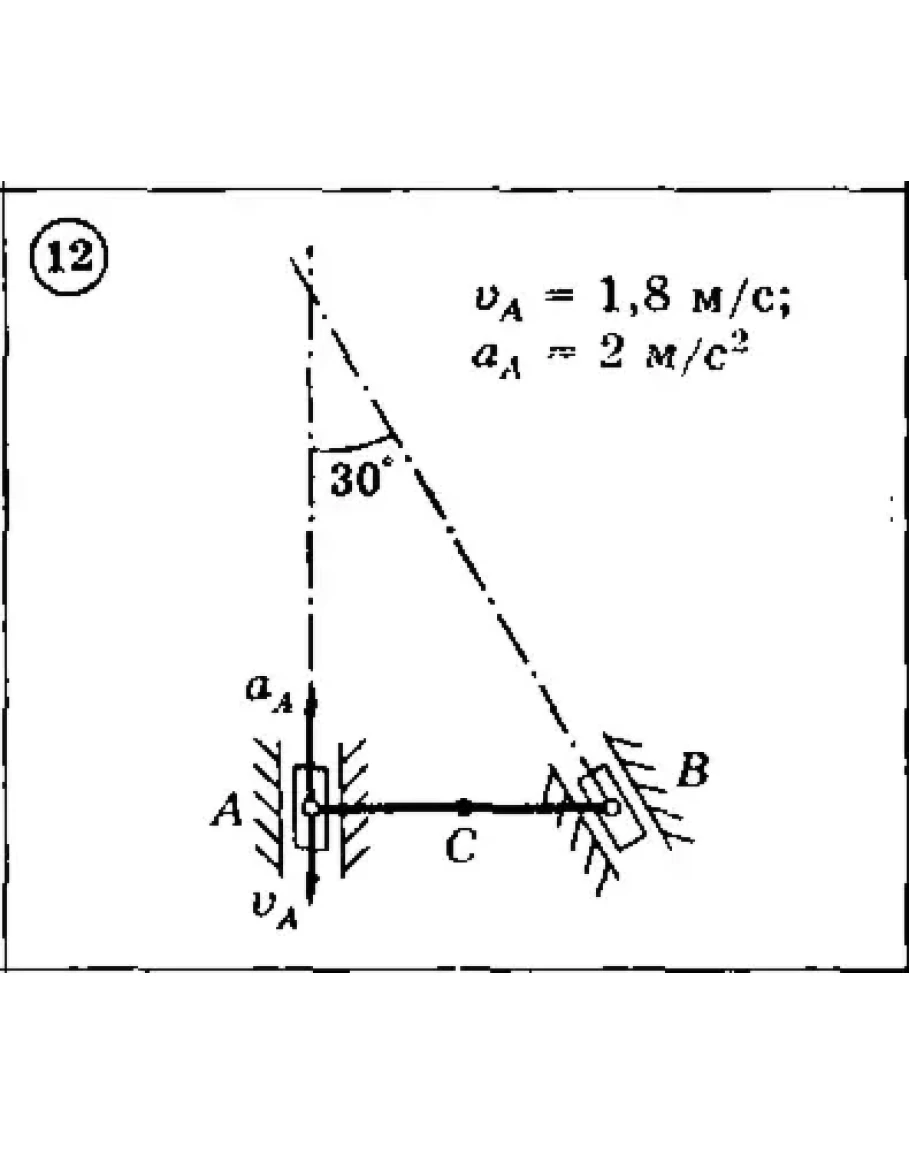 Для представленных на схемах 1-30 механизмов, состоящих из шатуна АВ длиной 2 м и двух ползунов, по заданным величинам скорости и ускорения ползуна А определить скорость и ускорение ползуна В и средней точки С шатуна, а также угловую скорость и угловое ускорение шатуна.
