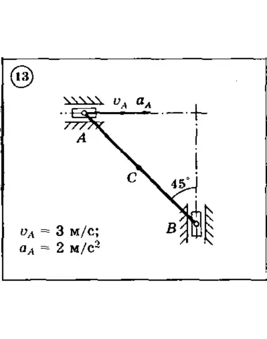 Для представленных на схемах 1-30 механизмов, состоящих из шатуна АВ длиной 2 м и двух ползунов, по заданным величинам скорости и ускорения ползуна А определить скорость и ускорение ползуна В и средней точки С шатуна, а также угловую скорость и угловое ускорение шатуна.