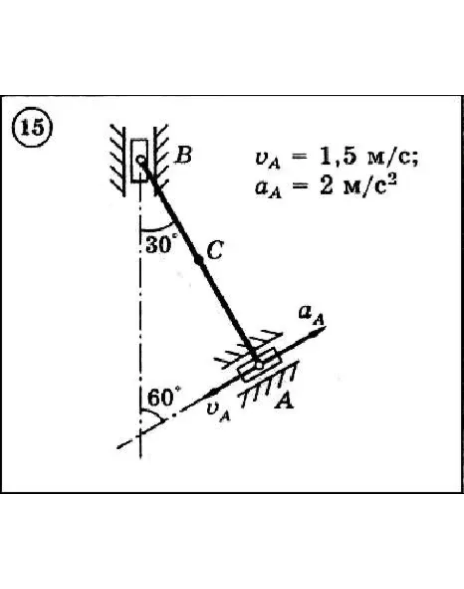 Для приведенного на схеме механизма, состоящего из шатуна AB длиной 2 м и двух ползунов, по заданным величинам скорости и ускорения ползуна A определить скорость и ускорение ползуна B и средней точки C шатуна, а также угловую скорость и угловое ускорение шатуна.