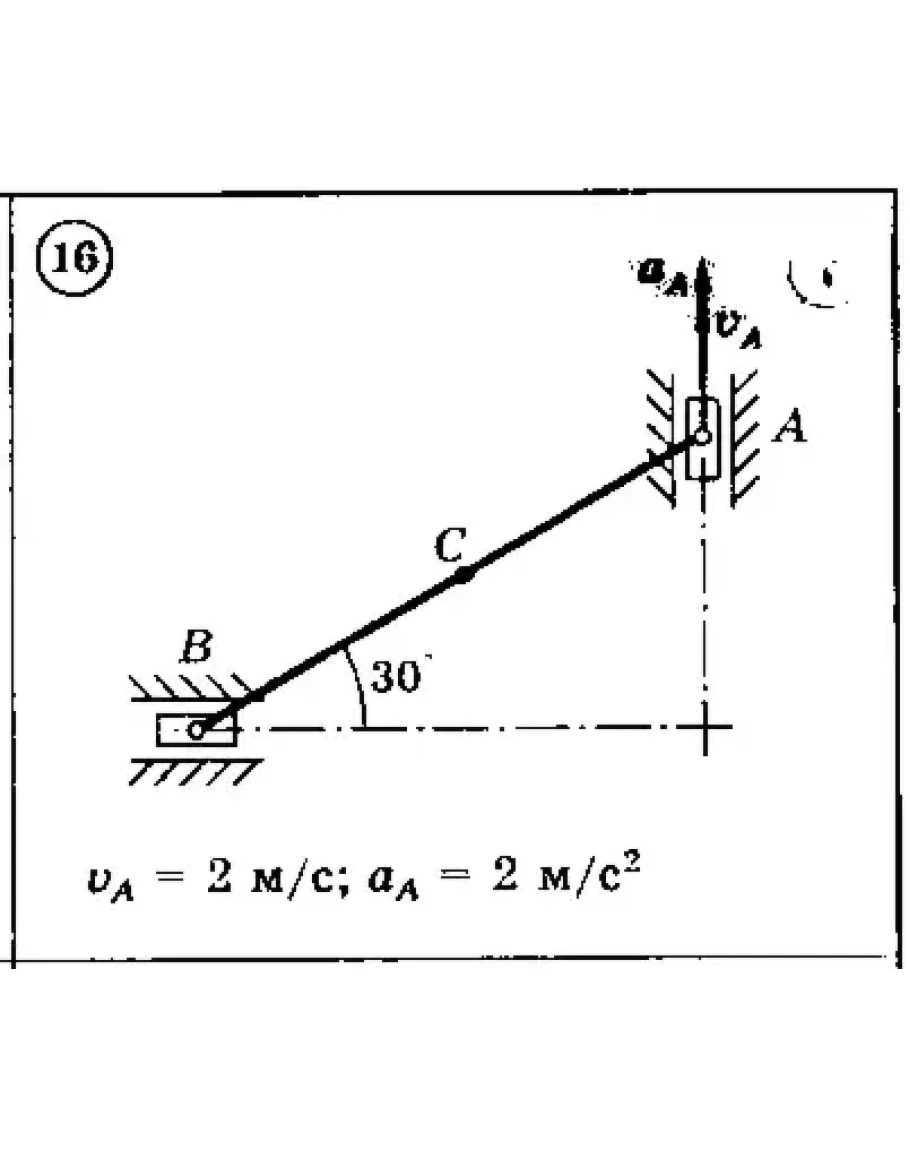 Для представленных на схемах 1-30 механизмов, состоящих из шатуна АВ длиной 2 м и двух ползунов, по заданным величинам скорости и ускорения ползуна А определить скорость и ускорение ползуна В и средней точки С шатуна, а также угловую скорость и угловое ускорение шатуна.
