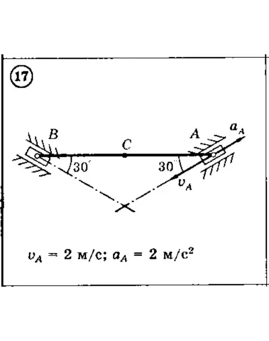 Для представленных на схемах 1-30 механизмов, состоящих из шатуна АВ длиной 2 м и двух ползунов, по заданным величинам скорости и ускорения ползуна А определить скорость и ускорение ползуна В и средней точки С шатуна, а также угловую скорость и угловое ускорение шатуна.