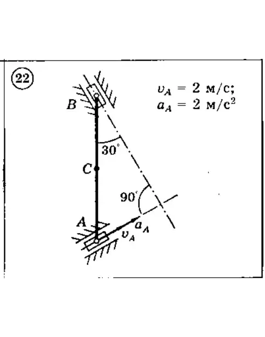 Для представленных на схемах 1-30 механизмов, состоящих из шатуна АВ длиной 2 м и двух ползунов, по заданным величинам скорости и ускорения ползуна А определить скорость и ускорение ползуна В и средней точки С шатуна, а также угловую скорость и угловое ускорение шатуна.