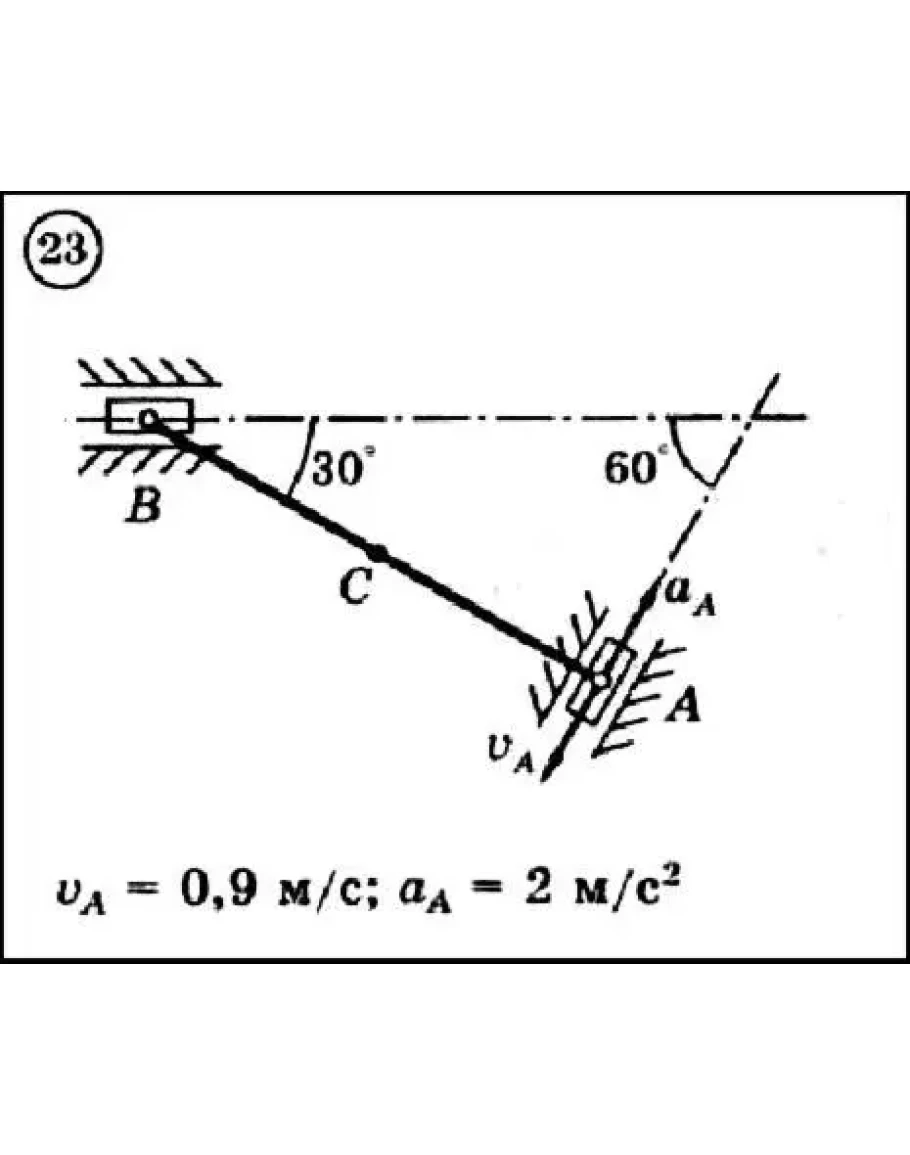 Для приведенного на схеме механизма, состоящего из шатуна AB длиной 2 м и двух ползунов, по заданным величинам скорости и ускорения ползуна A определить скорость и ускорение ползуна B и средней точки C шатуна, а также угловую скорость и угловое ускорение шатуна.