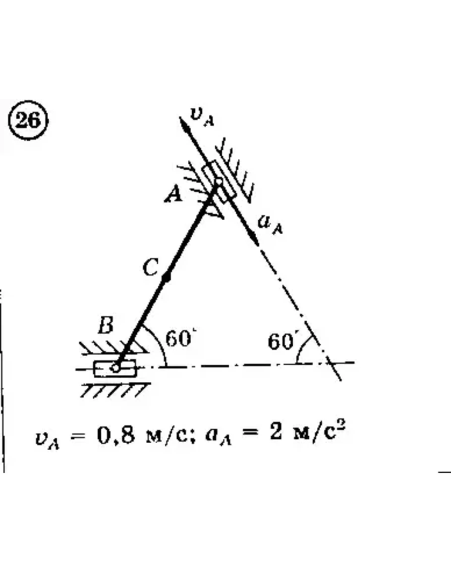 Для представленных на схемах 1-30 механизмов, состоящих из шатуна АВ длиной 2 м и двух ползунов, по заданным величинам скорости и ускорения ползуна А определить скорость и ускорение ползуна В и средней точки С шатуна, а также угловую скорость и угловое ускорение шатуна.