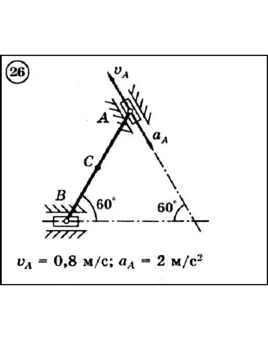 Для приведенного на схеме механизма, состоящего из шатуна AB длиной 2 м и двух ползунов, по заданным величинам скорости и ускорения ползуна A определить скорость и ускорение ползуна B и средней точки C шатуна, а также угловую скорость и угловое ускорение шатуна.