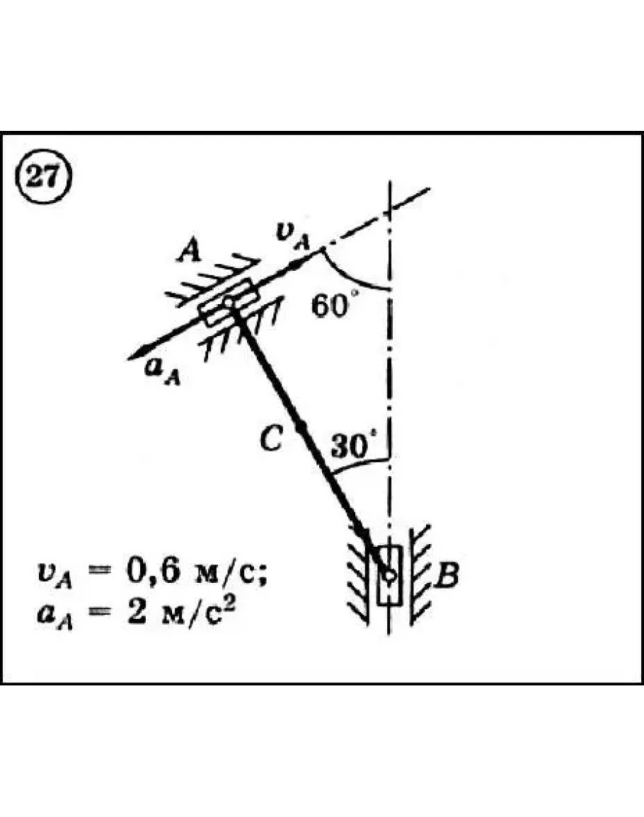 Для приведенного на схеме механизма, состоящего из шатуна AB длиной 2 м и двух ползунов, по заданным величинам скорости и ускорения ползуна A определить скорость и ускорение ползуна B и средней точки C шатуна, а также угловую скорость и угловое ускорение шатуна.
