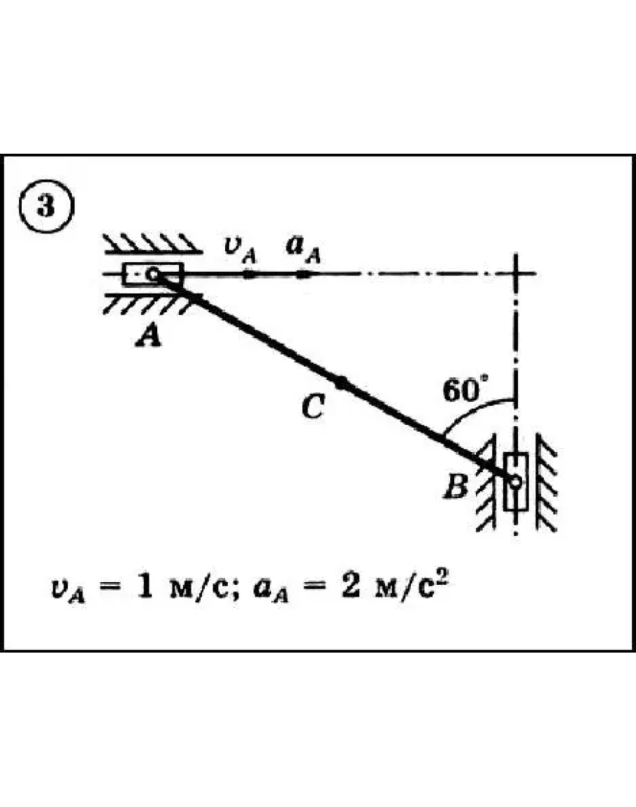 Для приведенного на схеме механизма, состоящего из шатуна AB длиной 2 м и двух ползунов, по заданным величинам скорости и ускорения ползуна A определить скорость и ускорение ползуна B и средней точки C шатуна, а также угловую скорость и угловое ускорение шатуна.