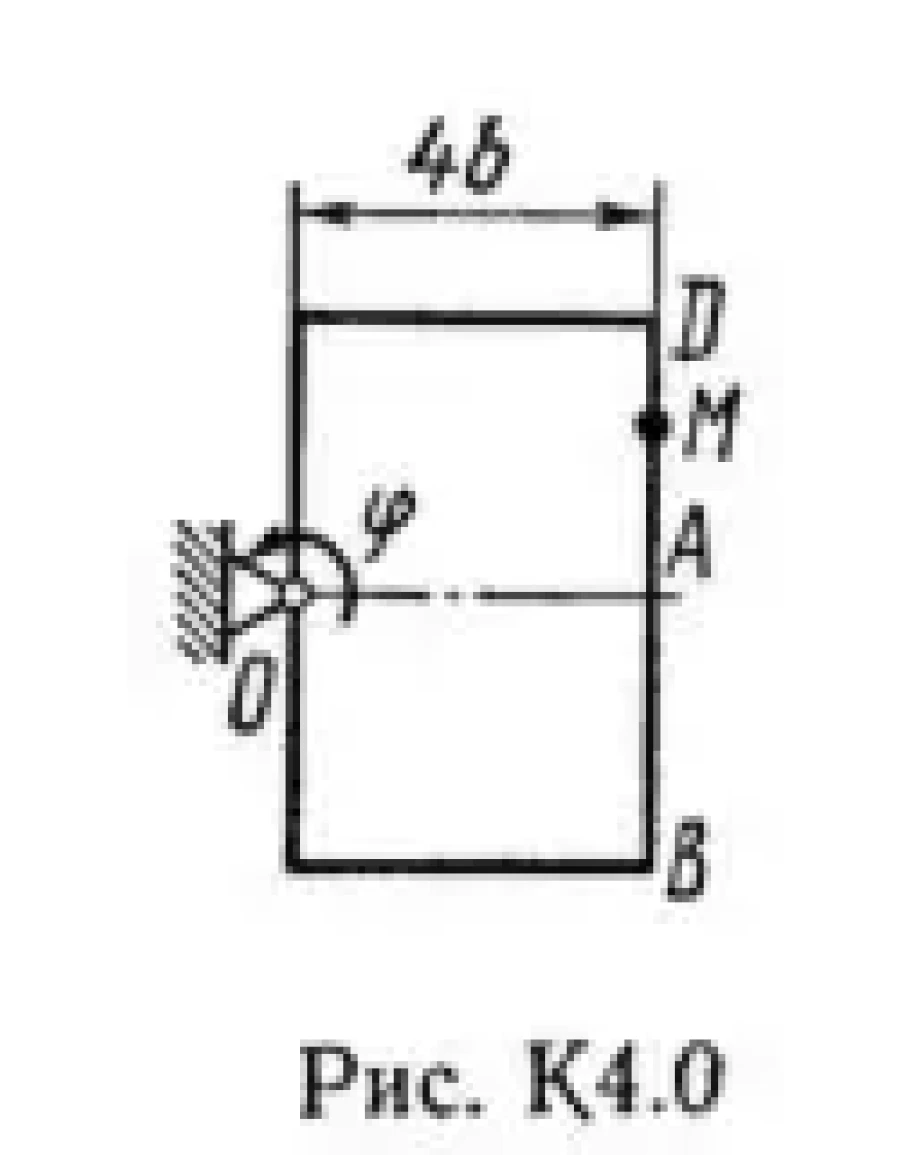 Прямоугольная пластина (рис. К4.0 — К4.4) или круглая пластина радиуса R = 60 см (рис. К4.5 — К4.9) вращается вокруг неподвижной оси по закону φ = f1(t), заданному в табл. К4. Положительное направление отсчета угла φ показано на рисунках дуговой стрелкой. На рис. 0, 1, 2, 5, 6 ось вращения перпендикулярна плоскости пластины и проходит через точку О (пластина вращается в своей плоскости); на рис. 3, 4, 7, 8, 9 ось вращения OO1 лежит в плоскости пластины (пластина вращается в пространстве)