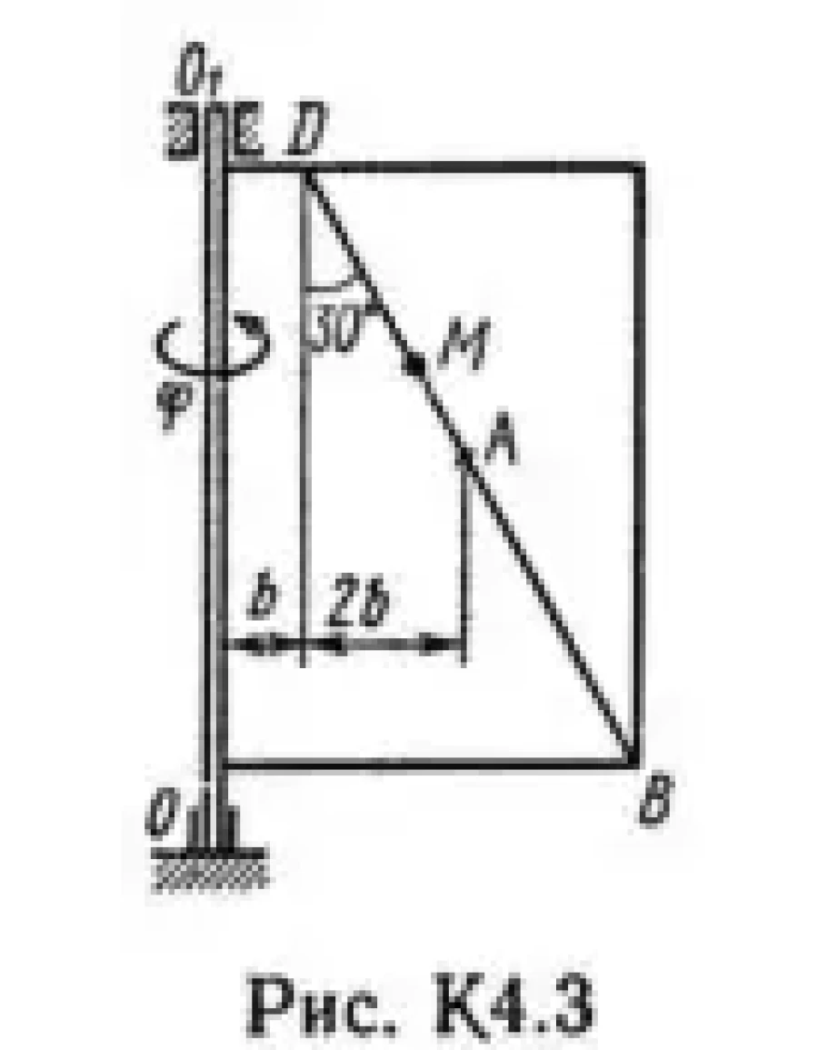 Прямоугольная пластина (рис. К4.0 — К4.4) или круглая пластина радиуса R = 60 см (рис. К4.5 — К4.9) вращается вокруг неподвижной оси по закону φ = f1(t), заданному в табл. К4. Положительное направление отсчета угла φ показано на рисунках дуговой стрелкой. На рис. 0, 1, 2, 5, 6 ось вращения перпендикулярна плоскости пластины и проходит через точку О (пластина вращается в своей плоскости); на рис. 3, 4, 7, 8, 9 ось вращения OO1 лежит в плоскости пластины (пластина вращается в пространстве)