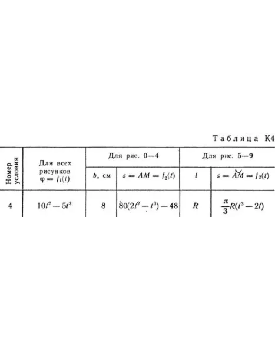 По пластине вдоль прямой BD (рис. 0—4) или по окружности радиуса R (рис. 5—9) движется точка М; закон ее относительного движения, т. е. зависимость s = AM = f2(t) (s выражено в сантиметрах, t — в секундах), задан в таблице отдельно для рис. 0—4 и для рис. 5—9; там же даны размеры b и l. На рисунках точка М показана в положении, при котором s = АМ>0 (при s<0 точка М находится по другую сторону от точки А).