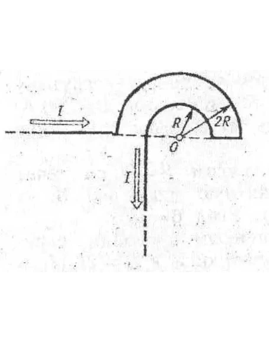 5. Бесконечно длинный провод с током I = 100 А изогнут так, как это показано на рис. Определить магнитную индукцию В в точке О. Радиус дуги R = 10 см