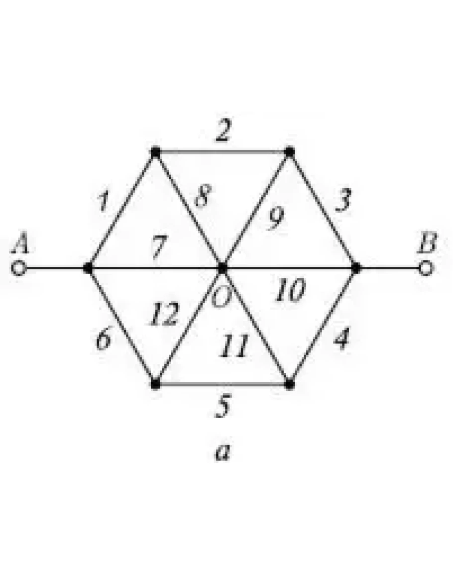 10. Определите общее сопротивление между точками А и В цепи проводников в виде шестиугольника (рис. а). Сопротивление каждой проволоки r = 1 Ом.