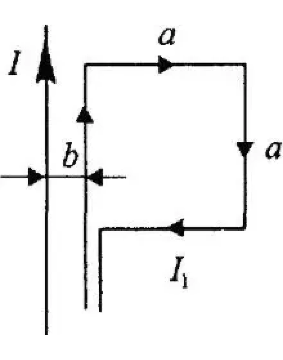 47. Контур из провода, изогнутого в форме квадрата со стороной a = 0,5 м, расположен в одной плоскости с бесконечным прямолинейным проводом с током I = 5 А ток что две его стороны параллельны проводу. Сила тока в контуре I1 = 1 А. Определите силу, действующую на контур, если ближайшая к проводу сторона контура находится на расстоянии b = 10 см. Направления токов указаны на рисунке.