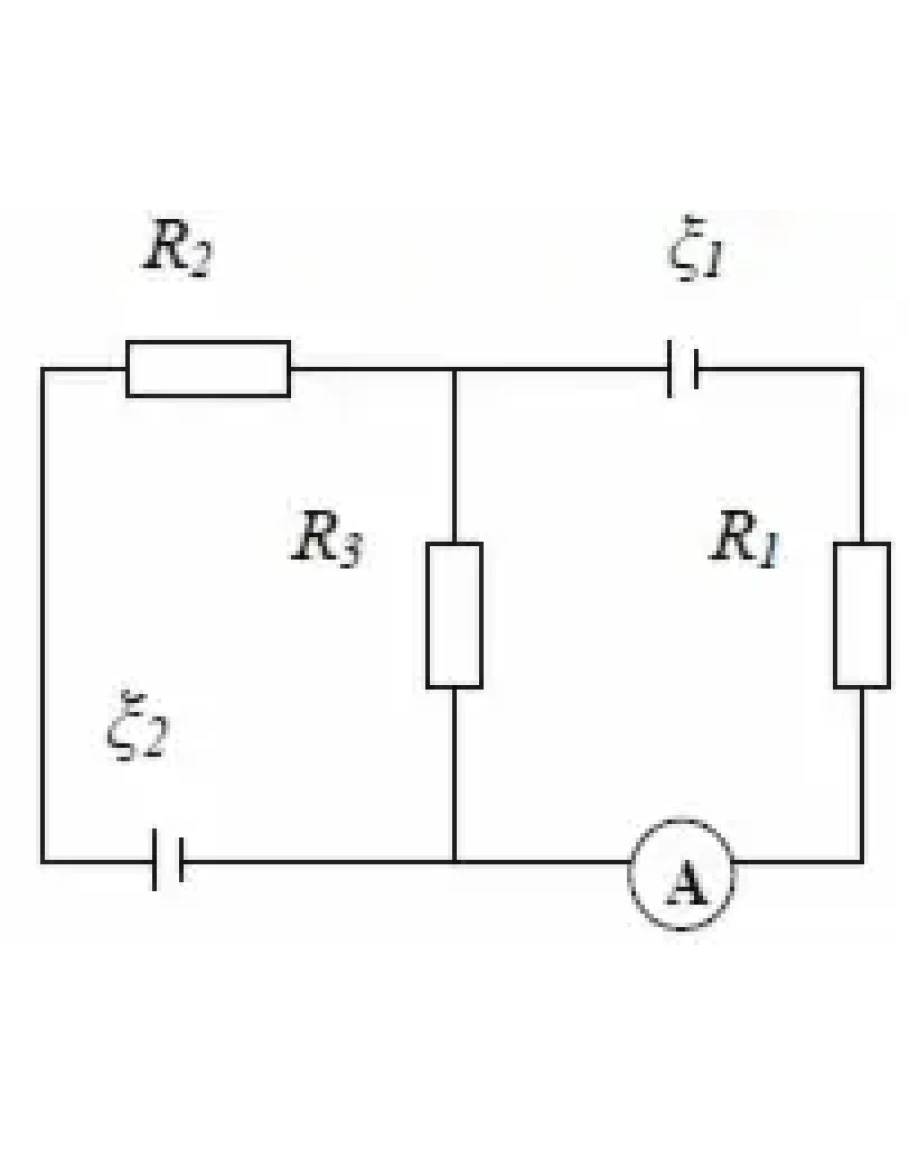 83. В схеме, представленной на рисунке, ξ1=110В, ξ2=220В, R1 = R2 = R = 100 Ом, R3 = 500 Ом. Найти показание амперметра. Внутренними сопротивлениями амперметра и элементов пренебречь.