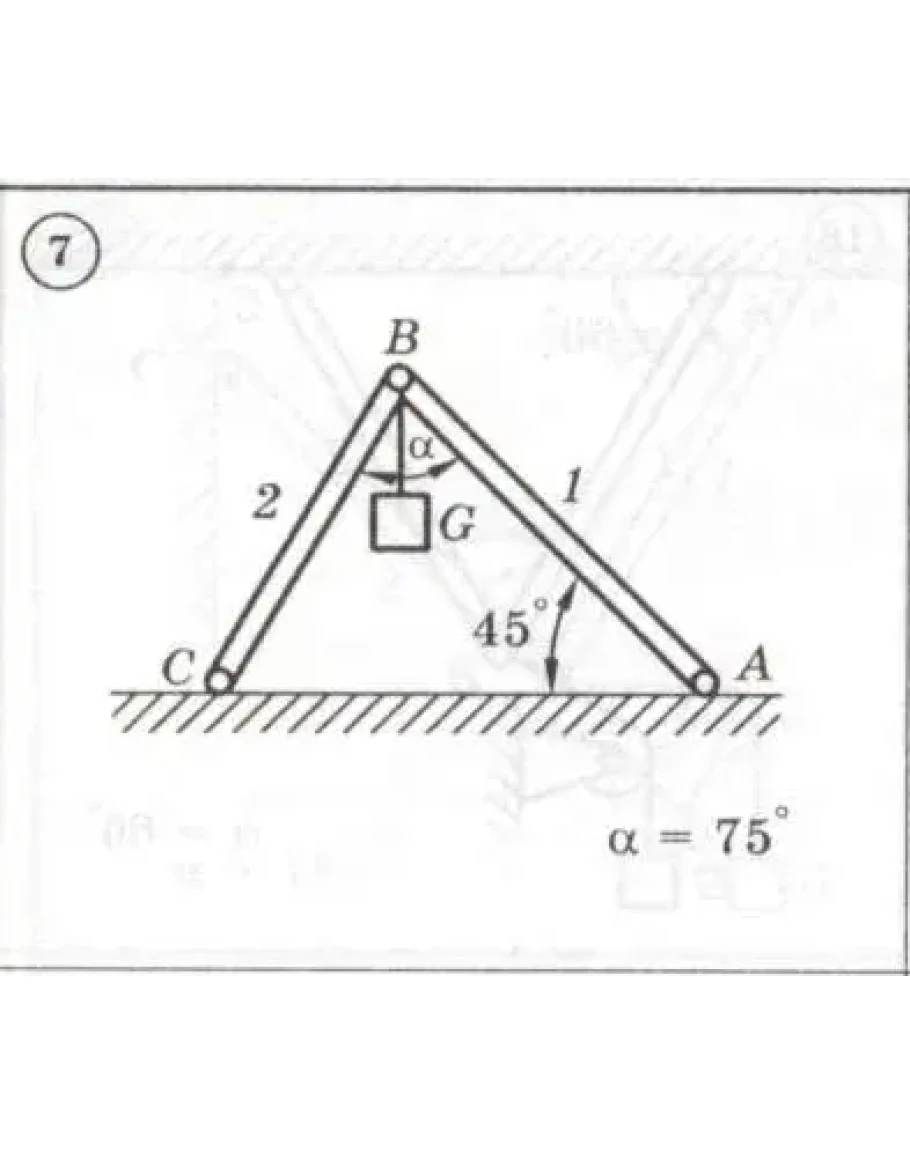 Задание Статика 1 (С1) по теме система сходящихся сил: Для представленных на схемах 1-30 механических систем найти усилия в опорных стержнях 1 и 2. Вес груза G = 10 кН, стержни, блоки и тросы невесомы. Решение задачи для варианта: 7