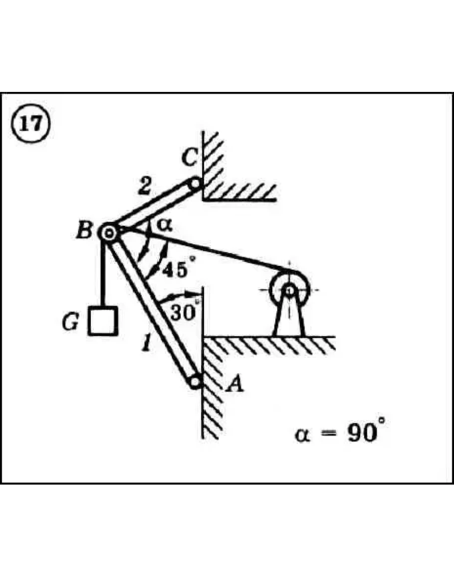 Для представленной на рисунке механической системы найти усилия в опорных стержнях 1 и 2. Вес груза G = 10кН, стержни, блоки и тросы невесомы