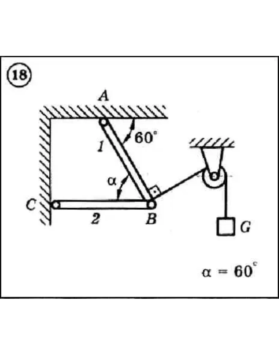 Для представленной на рисунке механической системы найти усилия в опорных стержнях 1 и 2. Вес груза G = 10кН, стержни, блоки и тросы невесомы