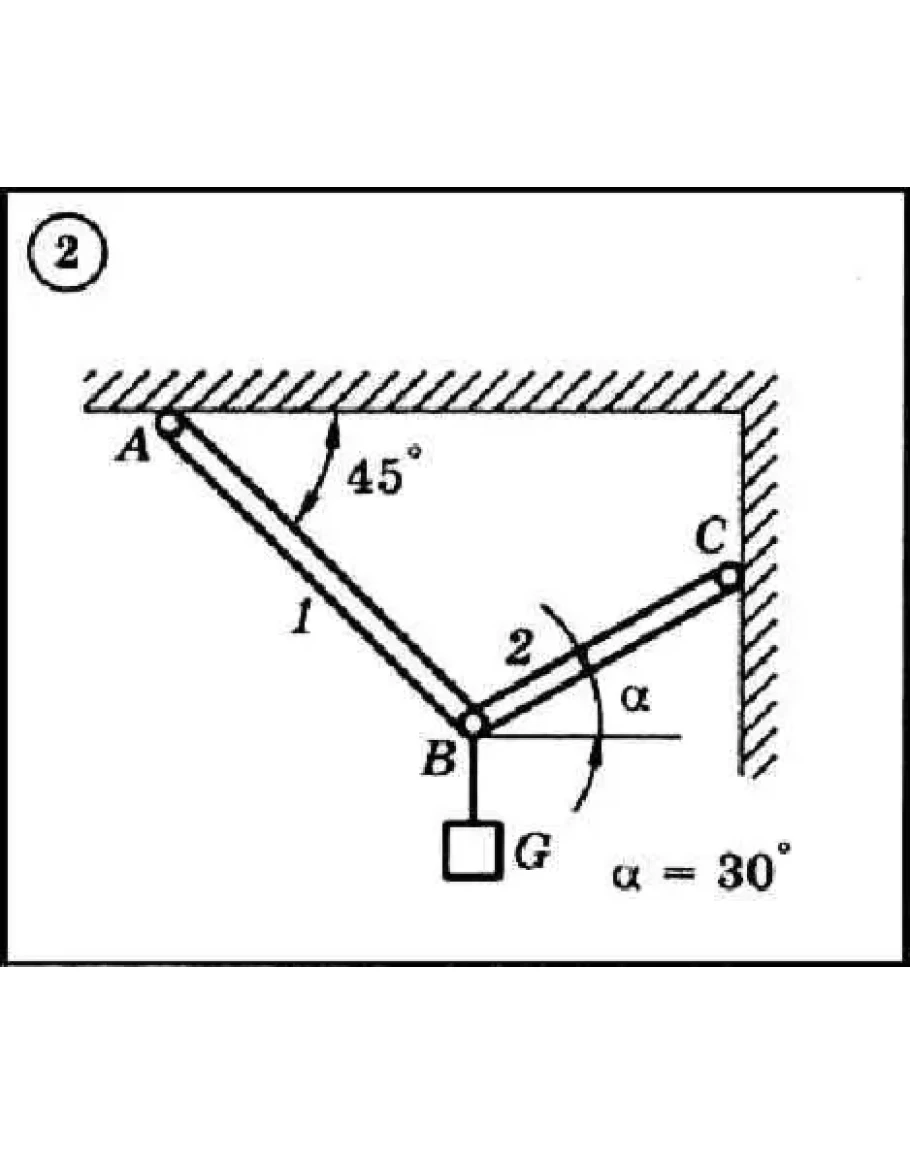 Для представленной на рисунке механической системы найти усилия в опорных стержнях 1 и 2. Вес груза G = 10кН, стержни, блоки и тросы невесомы