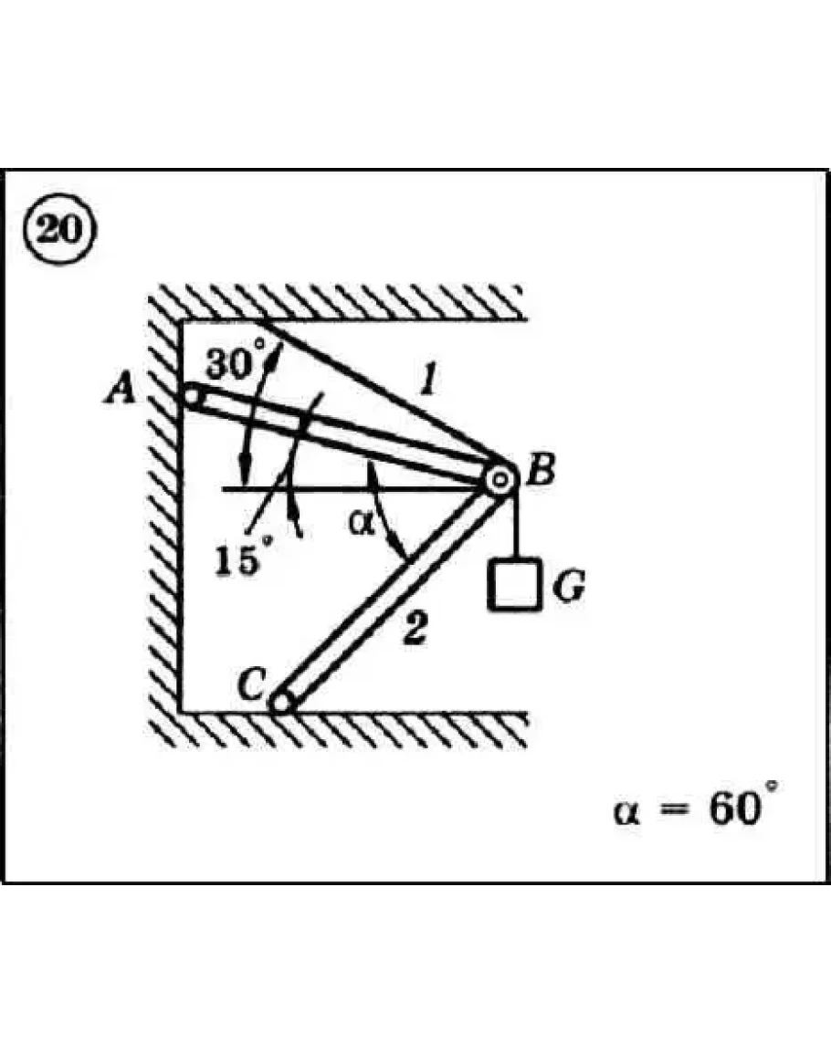 Для представленной на рисунке механической системы найти усилия в опорных стержнях 1 и 2. Вес груза G = 10кН, стержни, блоки и тросы невесомы