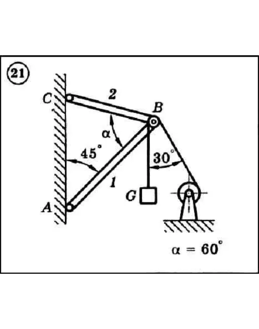 Для представленной на рисунке механической системы найти усилия в опорных стержнях 1 и 2. Вес груза G = 10кН, стержни, блоки и тросы невесомы