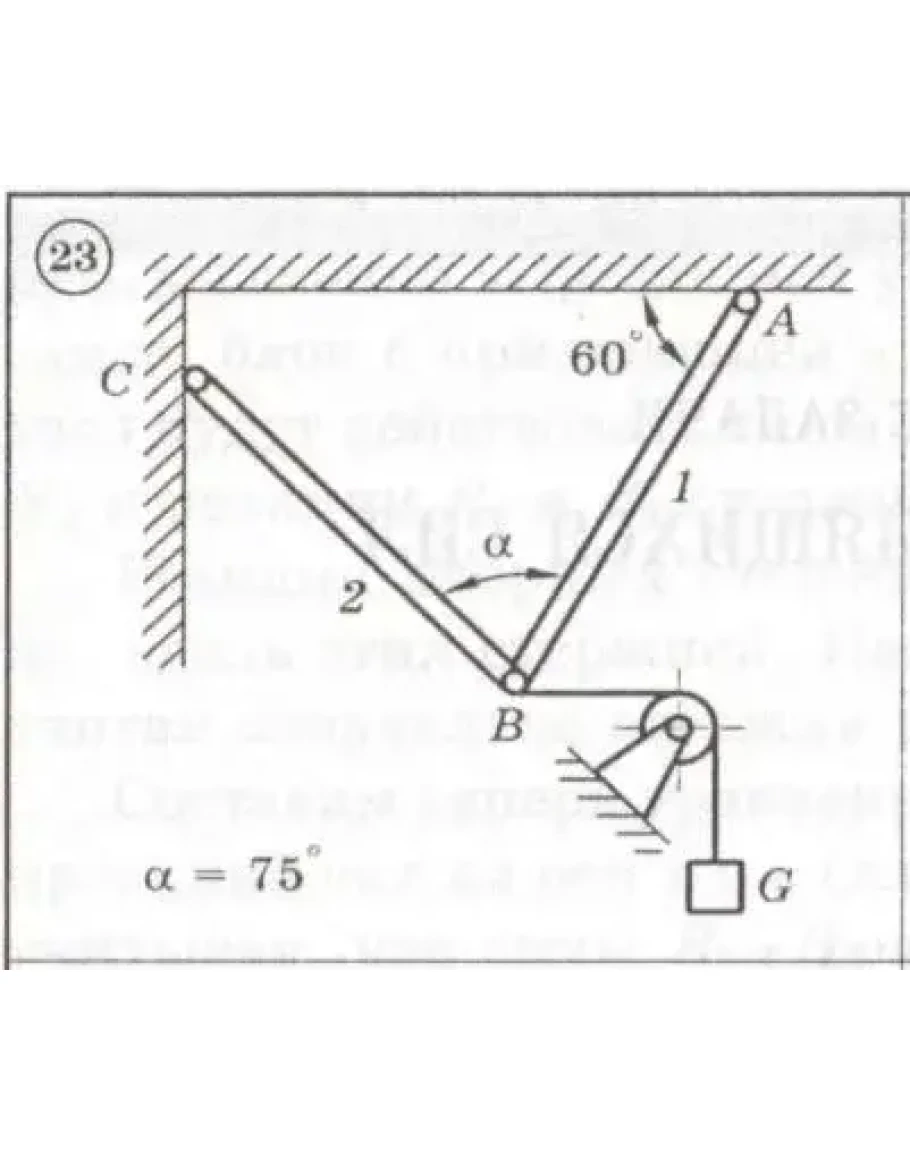 Задание Статика 1 (С1) по теме система сходящихся сил: Для представленных на схемах 1-30 механических систем найти усилия в опорных стержнях 1 и 2. Вес груза G = 10 кН, стержни, блоки и тросы невесомы. Решение задачи для варианта: 23