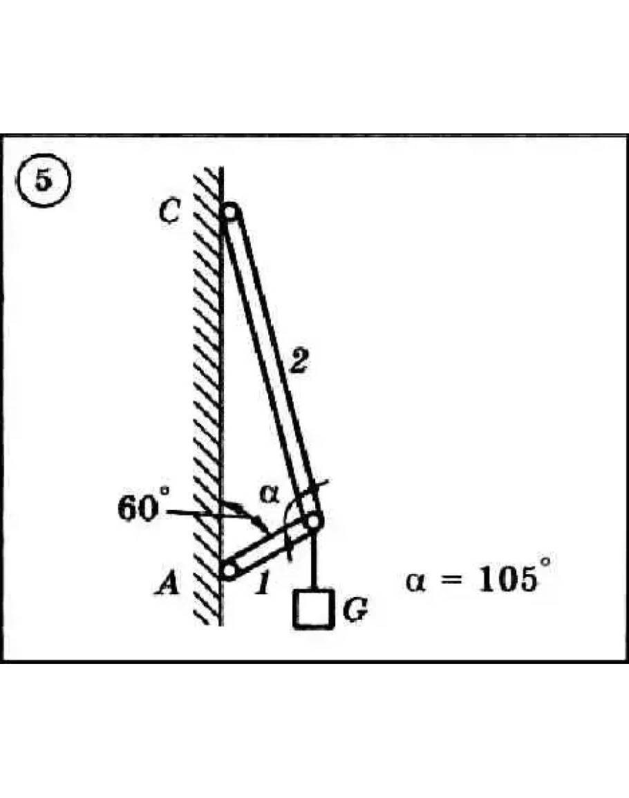 Для представленной на рисунке механической системы найти усилия в опорных стержнях 1 и 2. Вес груза G = 10кН, стержни, блоки и тросы невесомы