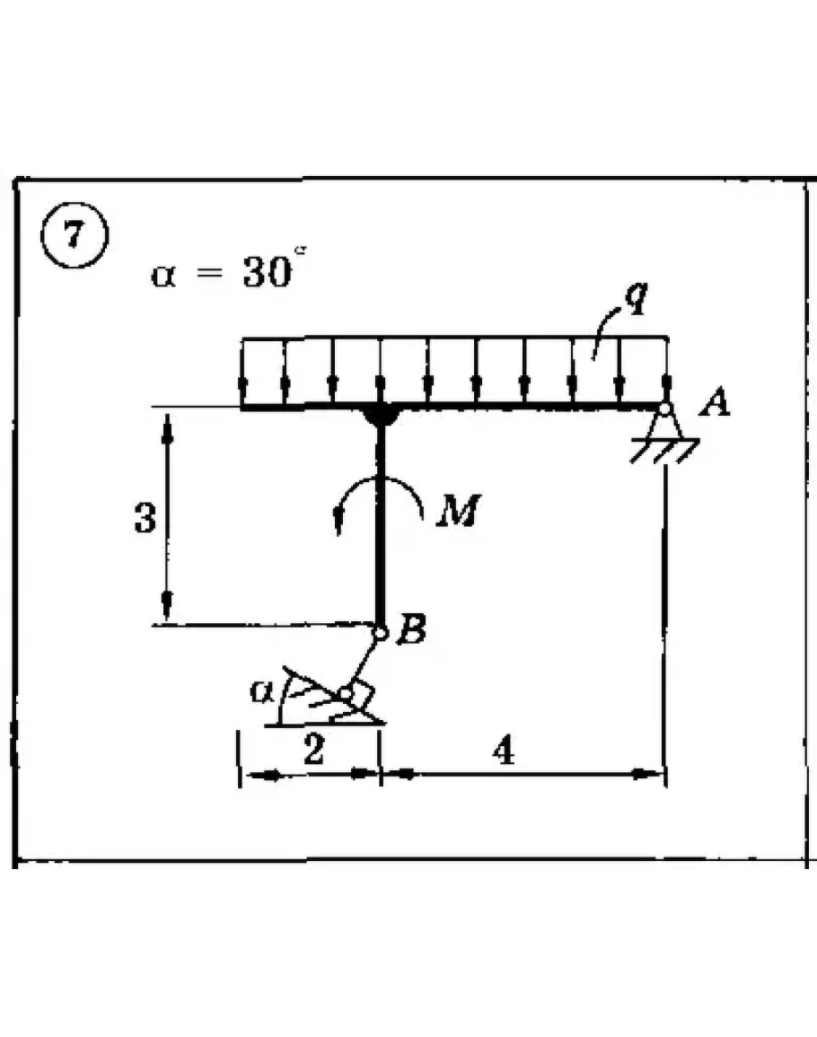 Для представленных на схемах 1-30 тел определить реакции опор. Приведенные на схемах нагрузки имеют следующие величины: вес груза G = 10 кН, сила F = 10 кН, момент пары сил М = 20 кН*м, интенсивность распределенной силы q = 5 кН/м, а также gmax = 5 кН/м. Размеры указаны в метрах. Весом тела следует пренебречь..