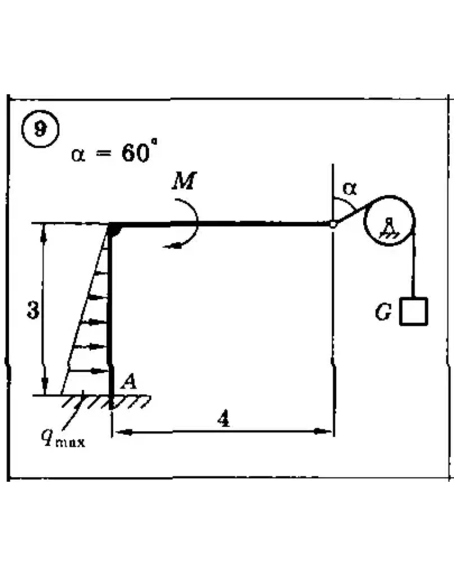 Для представленных на схемах 1-30 тел определить реакции опор. Приведенные на схемах нагрузки имеют следующие величины: вес груза G = 10 кН, сила F = 10 кН, момент пары сил М = 20 кН*м, интенсивность распределенной силы q = 5 кН/м, а также gmax = 5 кН/м. Размеры указаны в метрах. Весом тела следует пренебречь..