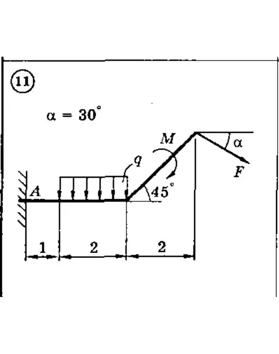 Для представленных на схемах 1-30 тел определить реакции опор. Приведенные на схемах нагрузки имеют следующие величины: вес груза G = 10 кН, сила F = 10 кН, момент пары сил М = 20 кН*м, интенсивность распределенной силы q = 5 кН/м, а также gmax = 5 кН/м. Размеры указаны в метрах. Весом тела следует пренебречь..