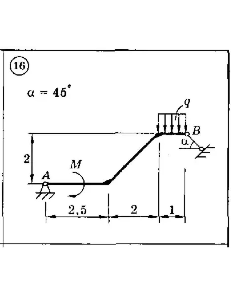 Для представленных на схемах 1-30 тел определить реакции опор. Приведенные на схемах нагрузки имеют следующие величины: вес груза G = 10 кН, сила F = 10 кН, момент пары сил М = 20 кН*м, интенсивность распределенной силы q = 5 кН/м, а также gmax = 5 кН/м. Размеры указаны в метрах. Весом тела следует пренебречь..