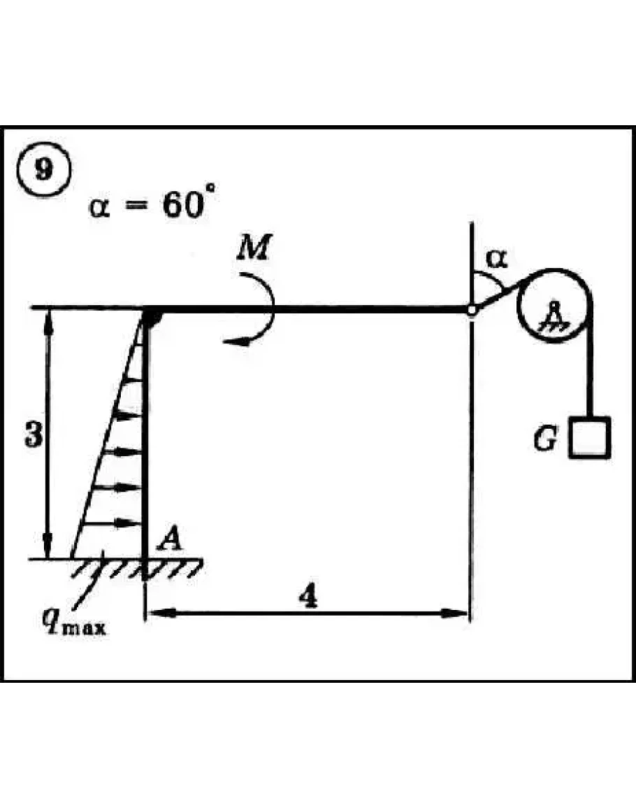 Для представленного на схеме тела определить реакции опор. Приведенные на схеме нагрузки имеют следующие величины: вес груза G = 10 кН, сила F = 10кН, момент пары сил М = 20 кНм, интенсивность распределенной силы q = 5 кН/м, а также qmax = 5 кН/м. Размеры указаны в метрах. Весом тела следует пренебречь.