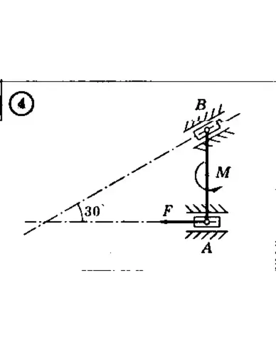 Для представленных на схемах 1-30 механизмов, расположенных в вертикальной плоскости, определить значения силы F из условия равновесия механизмов. Механизм состоит из однородного тонкого стержня АВ длиной L = 4м весом G = 15 кН и двух невесомых ползунов А и В, которые могут перемещаться по направляющим. На стержень действует пара сил с моментом М = 20 кН*м. Трение у ползуна В отсутствует, коэфициент трения ползуна А по направляющий f = 0,4. Размерами ползунов пренебречь.
