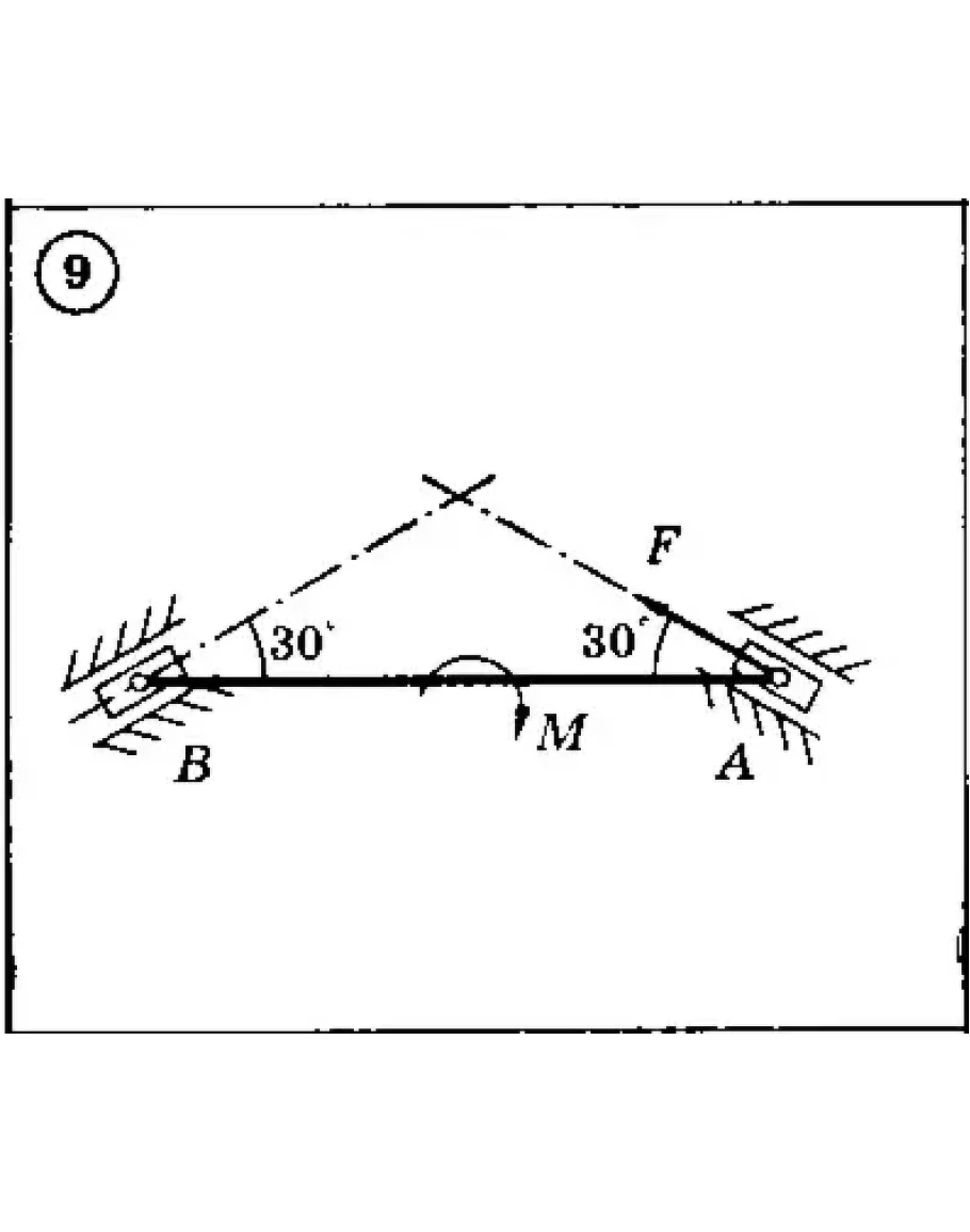 Для представленных на схемах 1-30 механизмов, расположенных в вертикальной плоскости, определить значения силы F из условия равновесия механизмов. Механизм состоит из однородного тонкого стержня АВ длиной L = 4м весом G = 15 кН и двух невесомых ползунов А и В, которые могут перемещаться по направляющим. На стержень действует пара сил с моментом М = 20 кН*м. Трение у ползуна В отсутствует, коэффициент трения ползуна А по направляющий f = 0,4. Размерами ползунов пренебречь.