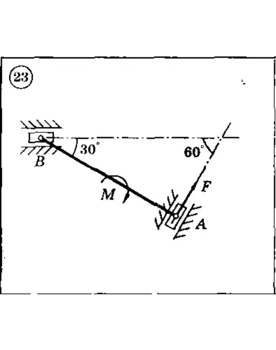 Для представленных на схемах 1-30 механизмов, расположенных в вертикальной плоскости, определить значения силы F из условия равновесия механизмов. Механизм состоит из однородного тонкого стержня АВ длиной L = 4м весом G = 15 кН и двух невесомых ползунов А и В, которые могут перемещаться по направляющим. На стержень действует пара сил с моментом М = 20 кН*м. Трение у ползуна В отсутствует, коэфaициент трения ползуна А по направляющий f = 0,4. Размерами ползунов пренебречь.