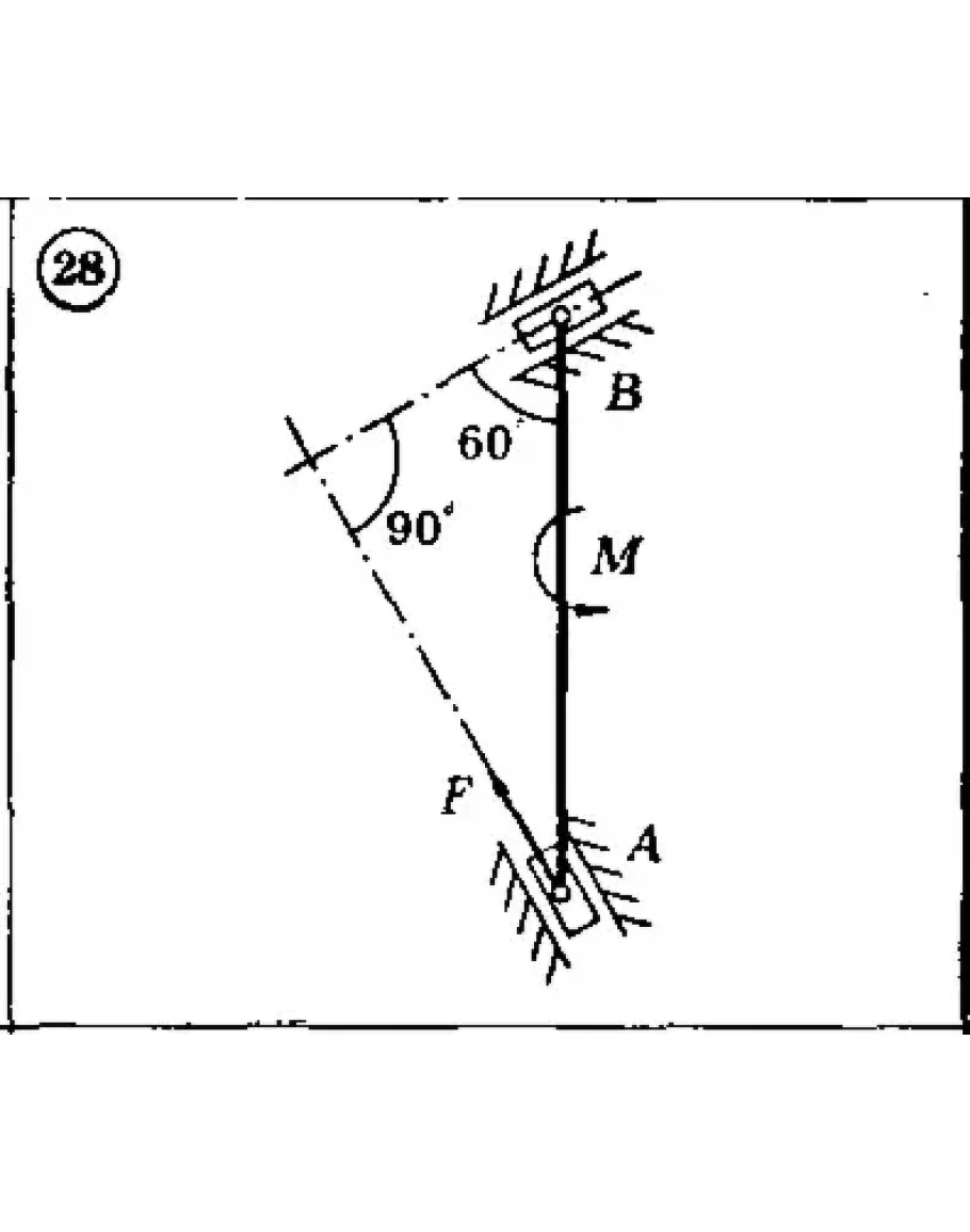 Для представленных на схемах 1-30 механизмов, расположенных в вертикальной плоскости, определить значения силы F из условия равновесия механизмов. Механизм состоит из однородного тонкого стержня АВ длиной L = 4м весом G = 15 кН и двух невесомых ползунов А и В, которые могут перемещаться по направляющим. На стержень действует пара сил с моментом М = 20 кН*м. Трение у ползуна В отсутствует, коэффициент трения ползуна А по направляющий f = 0,4. Размерами ползунов пренебречь.